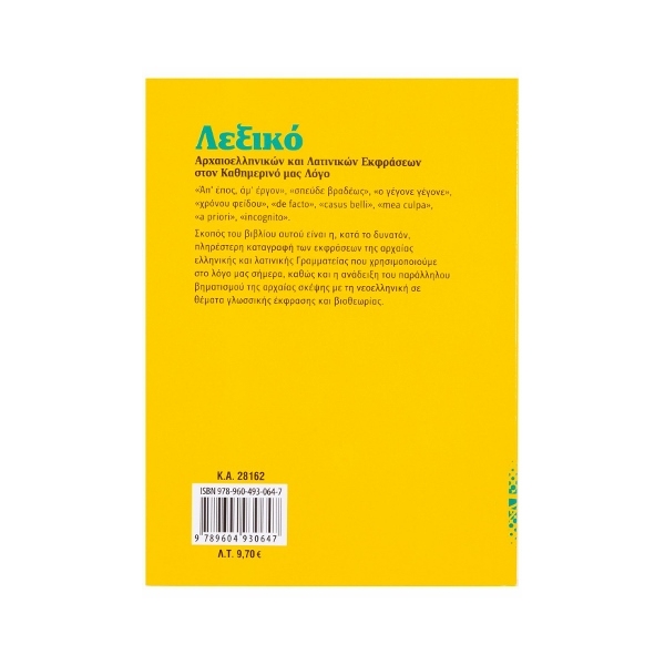 Σκοπός του βιβλίου αυτού είναι η, κατά το δυνατόν, πληρέστερη καταγραφή των εκφράσεων της αρχαίας ελληνικής και λατινικής γραμματείας που χρησιμοποιούμε στον λόγο μας σήμερα, καθώς και η ανάδειξη του παράλληλου βηματισμού της αρχαίας σκέψης με τη νεοελληνική σε θέματα γλωσσικής έκφρασης και βιοθεωρίας.