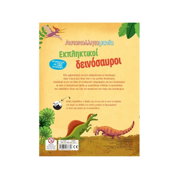 Πότε εμφανίστηκαν και πότε εξαφανίστηκαν οι δεινόσαυροι; Είχαν φτερά ή όχι; Ποιος ήταν ο πιο μεγάλος δεινόσαυρος; Ανακάλυψε αυτές και άλλες 97 εκπληκτικές πληροφορίες για τους δεινόσαυρους σε αυτό το διασκεδαστικό βιβλίο με αυτοκόλλητα. Κόλλησε τα αυτοκόλλητα στις κατάλληλες θέσεις και ζήσε την περιπέτεια στον κόσμο των δεινόσαυρων.