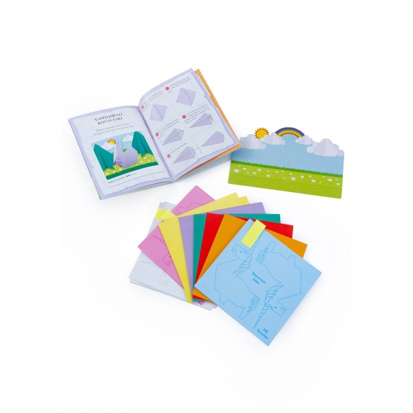 Το πακέτο περιλαμβάνει: • Βιβλίο με αναλυτικές οδηγίες για την κατασκευή οριγκάμι • 80 χρωματιστά χαρτιά • Σκηνικό από χαρτόνι.