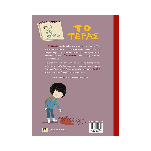 Μια μέρα που λείπει αποφασίζω να κρύψω το αγαπημένο του μπλοκ. Πριν το βάλω όμως στην τσάντα μου, του ρίχνω μια ματιά. Στις περισσότερες σελίδες έχει ζωγραφίσει ένα παιδί και ένα τέρας. Μόνο που το τέρας δε μοιάζει καθόλου με κείνον…