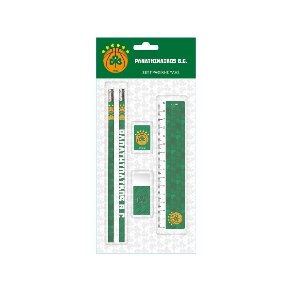 Σχολικό Σετ με τον ΠαναθηναϊκόΠεριέχει: 2 μολύβια με γόμα, 1 χάρακα 15 εκατοστών, 1 γόμα, 1 ξύστρα