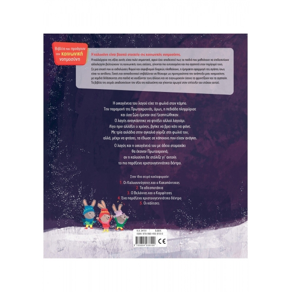 Το βιβλίο: Η οικογένεια του λαγού είχε τη φωλιά στον κάμπο. Την παραμονή της Πρωτοχρονιάς, όμως, η πεδιάδα πλημμύρισε και όσα ζώα έμεναν εκεί ξεσπιτώθηκαν. Ο λαγός αναγκάστηκε να φτιάξει αλλού λαγούμι. Λίγο πριν αλλάξει ο χρό-νος, βγήκε να βρει κάτι να φάνε. Με τρία αχλάδια στην αγκαλιά γύριζε στη φωλιά του, αλλά, μέχρι να φτάσει, τα έδωσε σε κάποιους που είχαν ανάγκη. Ο λαγός και η οικογένειά του με άδειο στομαχάκι θα έκαναν Πρωτοχρονιά, αν η καλοσύνη δε στόλιζε γι’ αυτούς το πιο παράξενο χριστουγεννιάτικο δέντρο.