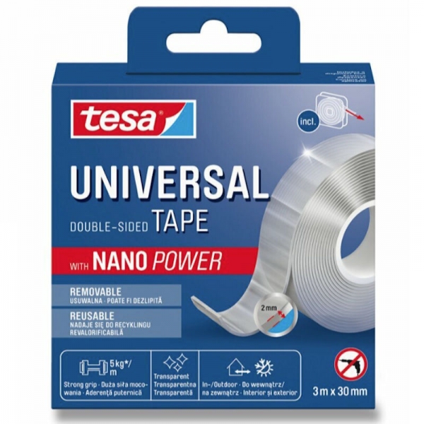 Tesa® Universal Nano ανθεκτική ταινία διπλής όψης με χωρητικότητα φορτίου έως 5 kg/m. Κρατάει με ασφάλεια και επιτρέπει τη χρήση της συσκευασίας, καθώς και την εύκολη αφαίρεση της χωρίς υπολείμματα. Ιδανικό για οικιακά και DIY έργα.