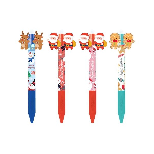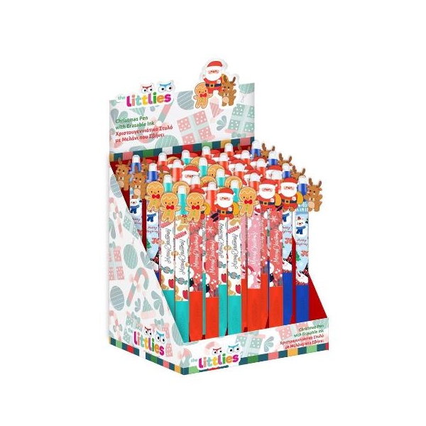 Χριστουγεννιάτικο Στυλό με μελάνι που σβήνει The Littlies, ένα πρακτικό εργαλείο γραφής, εμπνευσμένο από την εορταστική περίοδο σε 4 χαρούμενα χριστουγεννιάτικα σχέδια. Το μελάνι του είναι ειδικά σχεδιασμένο ώστε να σβήνεται εύκολα, προσφέροντας ευκολία και διασκέδαση στις καθημερινές σημειώσεις ή τις σχολικές εργασίες. Ιδανικό για το σχολείο, το σπίτι ή ως χριστουγεννιάτικο δώρο, συνδυάζει λειτουργικότητα και εορταστική διάθεση, προωθώντας τη δημιουργικότητα των παιδιών.