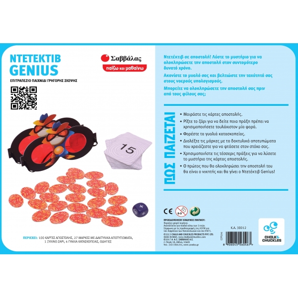 Το κουτί περιλαμβάνει: 100 κάρτες αποστολής, 27 μάρκες με δακτυλικά αποτυπώματα, 1 ξύλινο ζάρι, 4 γυαλιά κατασκοπείας, οδηγίες.