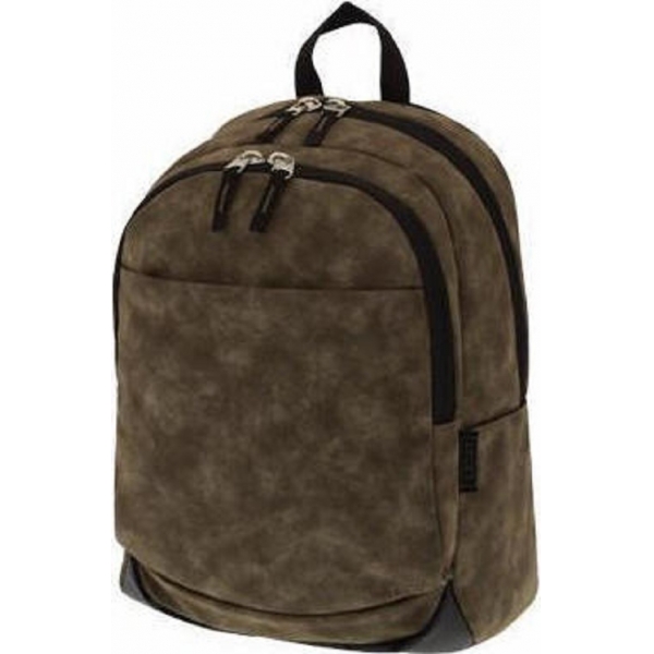 Σακίδιο πλάτης κατασκευασμένο από ανθεκτικό ύφασμα suede. Έχει δύο μεγάλη κεντρικές θήκες και μία μικρότερη τσέπη μπροστά που κλείνουν με φερμουάρ καθώς και πλαϊνές θήκες για παγούρι. Έχει ελαφρώς ενισχυμένη πλάτη και πάτο. Ενισχυμένοι ιμάντες πλάτης.