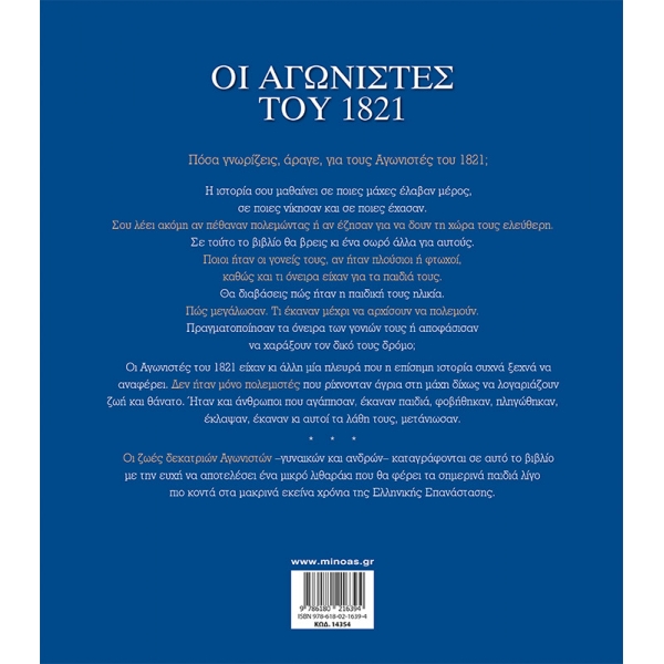 Η ιστορία σου μαθαίνει σε ποιες μάχες έλαβαν μέρος, σε ποιες νίκησαν και σε ποιες έχασαν. Σου λέει ακόμη αν πέθαναν πολεμώντας ή αν έζησαν για να δουν τη χώρα τους ελεύθερη. Σε τούτο το βιβλίο θα βρεις κι ένα σωρό άλλα για αυτούς. Ποιοι ήταν οι γονείς τους, αν ήταν πλούσιοι ή φτωχοί, καθώς και τι όνειρα είχαν για τα παιδιά τους.