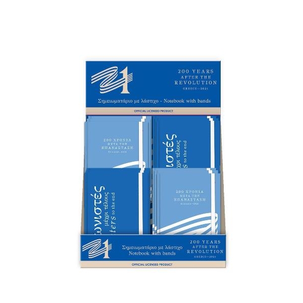 Σημειωματάριο Με Λάστιχο 10Χ13,5, σε 4 σχέδια, με 96 φύλλα, "Ελλάδα 2021". Γιορτάζουμε το έτος της συμβολικής επετείου για τα 200 χρόνια από την επανάσταση με τα αυθεντικά προϊόντα "Ελλάδα 2021".