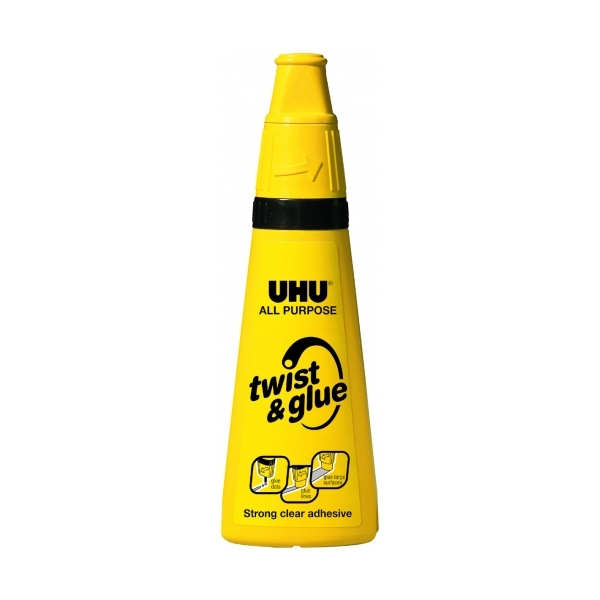 UHU Multi Purpose Adhesive twist & glue solvent free, the crystal-clear multi-purpose adhesive in a handy and soft bottle. Unique 3-position twist-applicator for gluing of dots, lines and surfaces. Ideal for a wide range of applications at home , at the office, at school and kindergarten, for craftwork and modelling, etc. Can be washed out with soap. UHU Multi Purpose Adhesive twist & glue solvent free makes gluing easy and is tested dermatologically. Its unique bottle is easily refillable.
